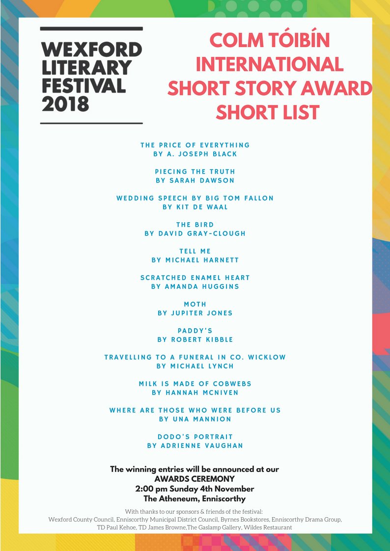 Exceedingly pleased indeed to be on the shortlist for the Colm Toibin International Short Story Award!